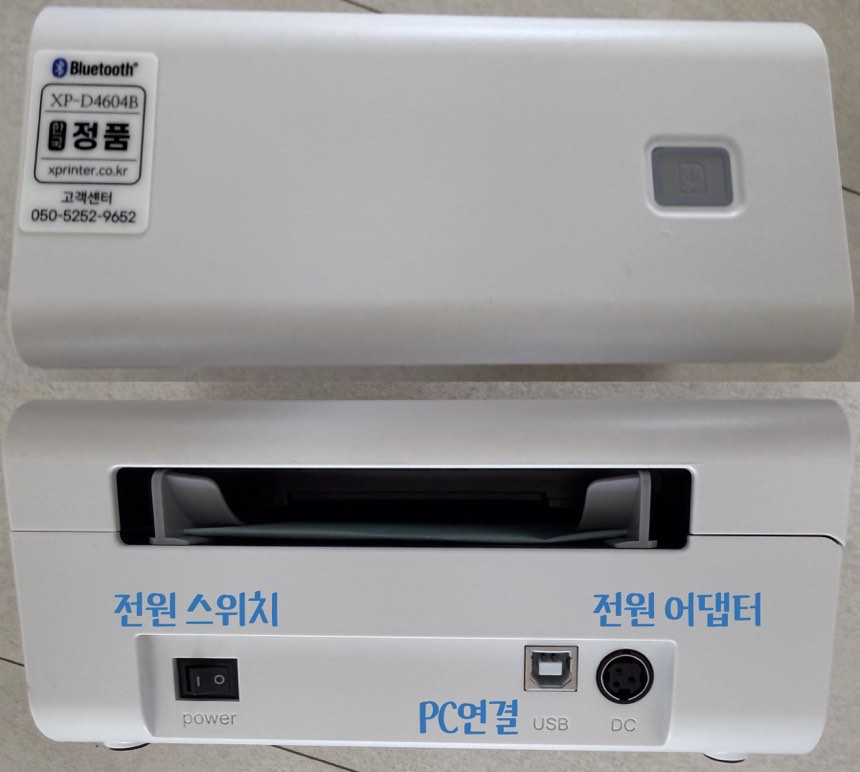 구매한 프린터 모델명은 XP-D4604B입니다. 구성품은 전원 어댑터와, 프린터기, 설명서, USB 케이블입니다. 저는 휴대폰으로 쓸 거라서 전원 케이블만 연결했습니다. 블루투스로 쓰면 꼭 컴퓨터 옆에 프린터기 놓지 않아도 되어서 좋아요.
